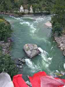Pushing aside my reservations and allowing my competitive side to take hold, off we went. Biking along the windy road, with the river rushing below and the bright green of rice paddies shimmering in the sun, my sense of exhilaration was complete. It almost made me forget about the head wind, and the fact that I was panting from altitude while going downhill…
